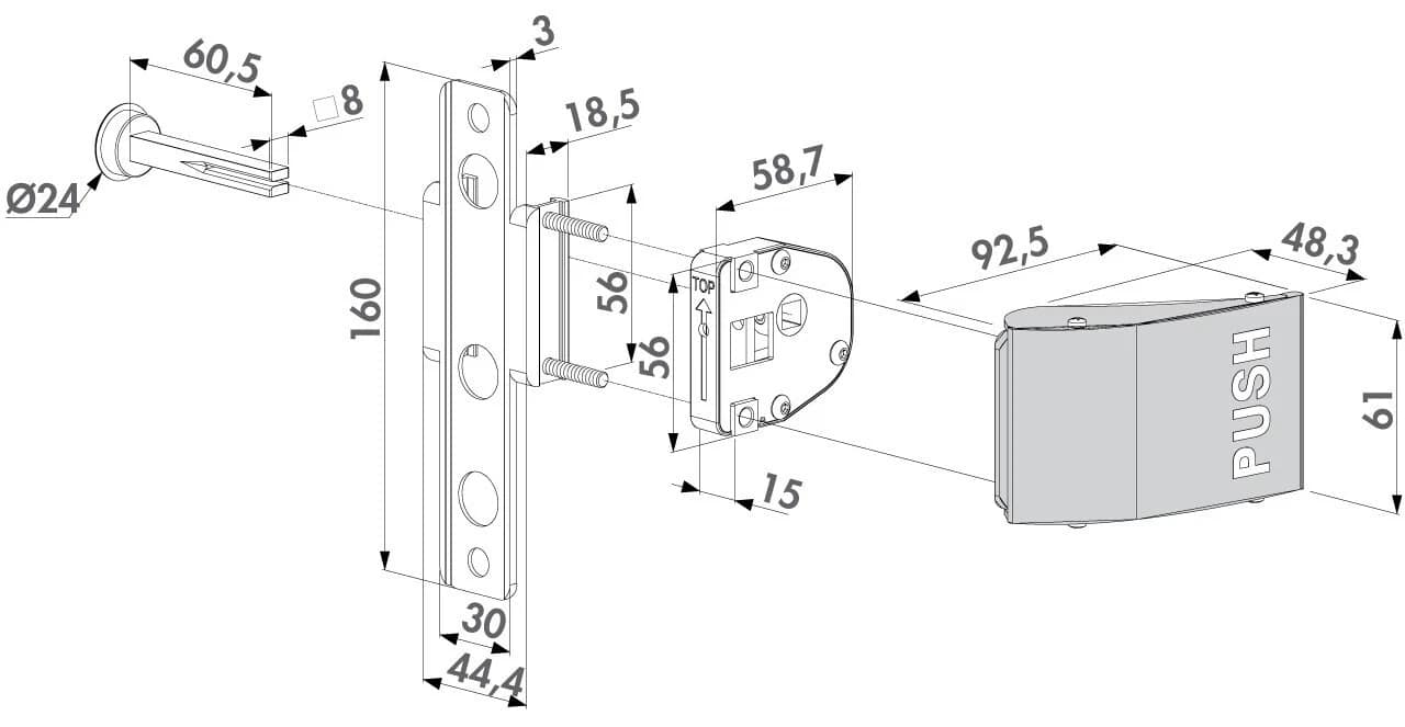 The Locinox Push Pad Handle Set Aluminium 3006PUSH is a strong, weather-resistant gate handle with a secure push pad design, ideal for residential, commercial, and industrial gates.